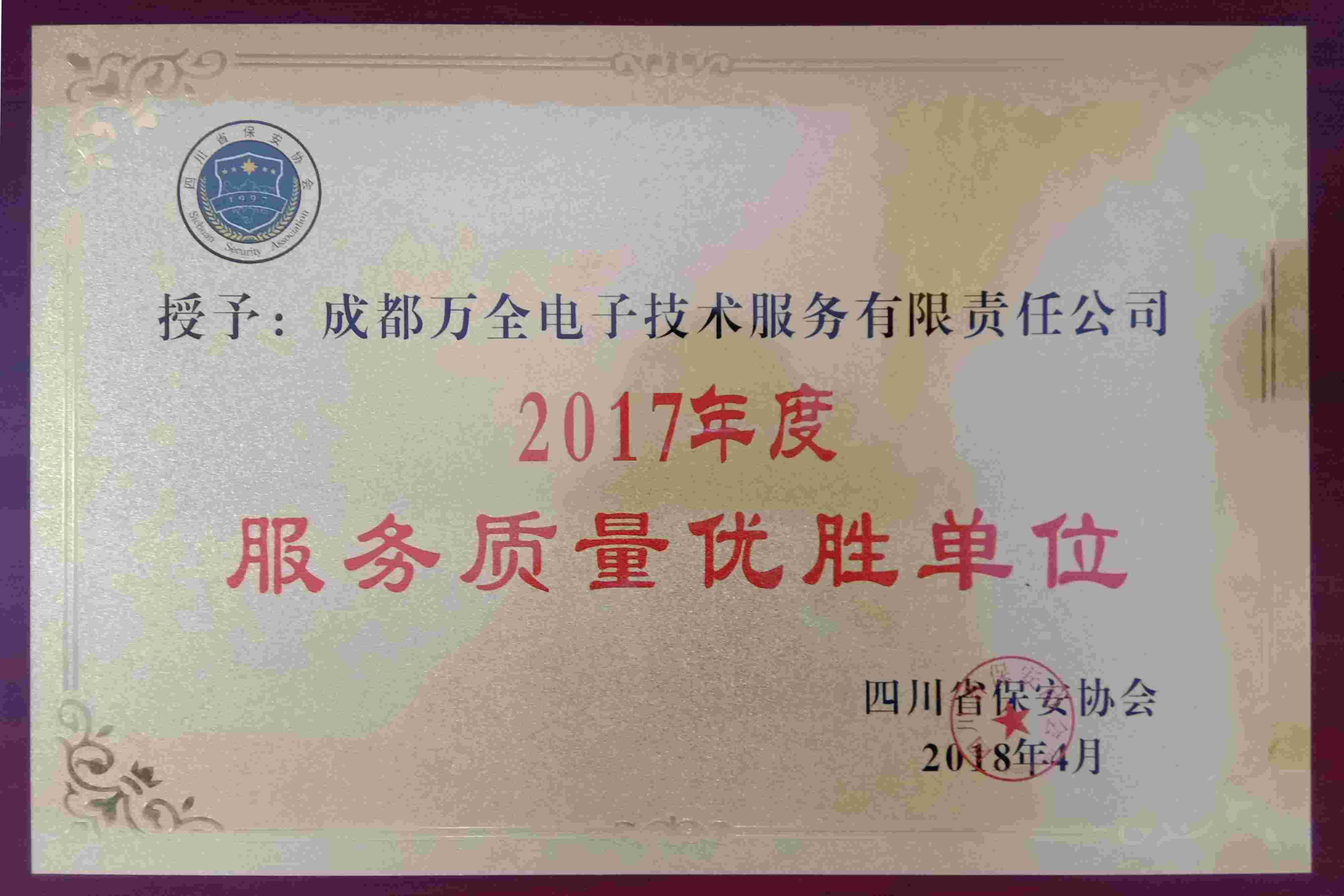 2017年4月四川省安保協會授予成都萬全電子“2017年度服務質量優勝單位”稱號