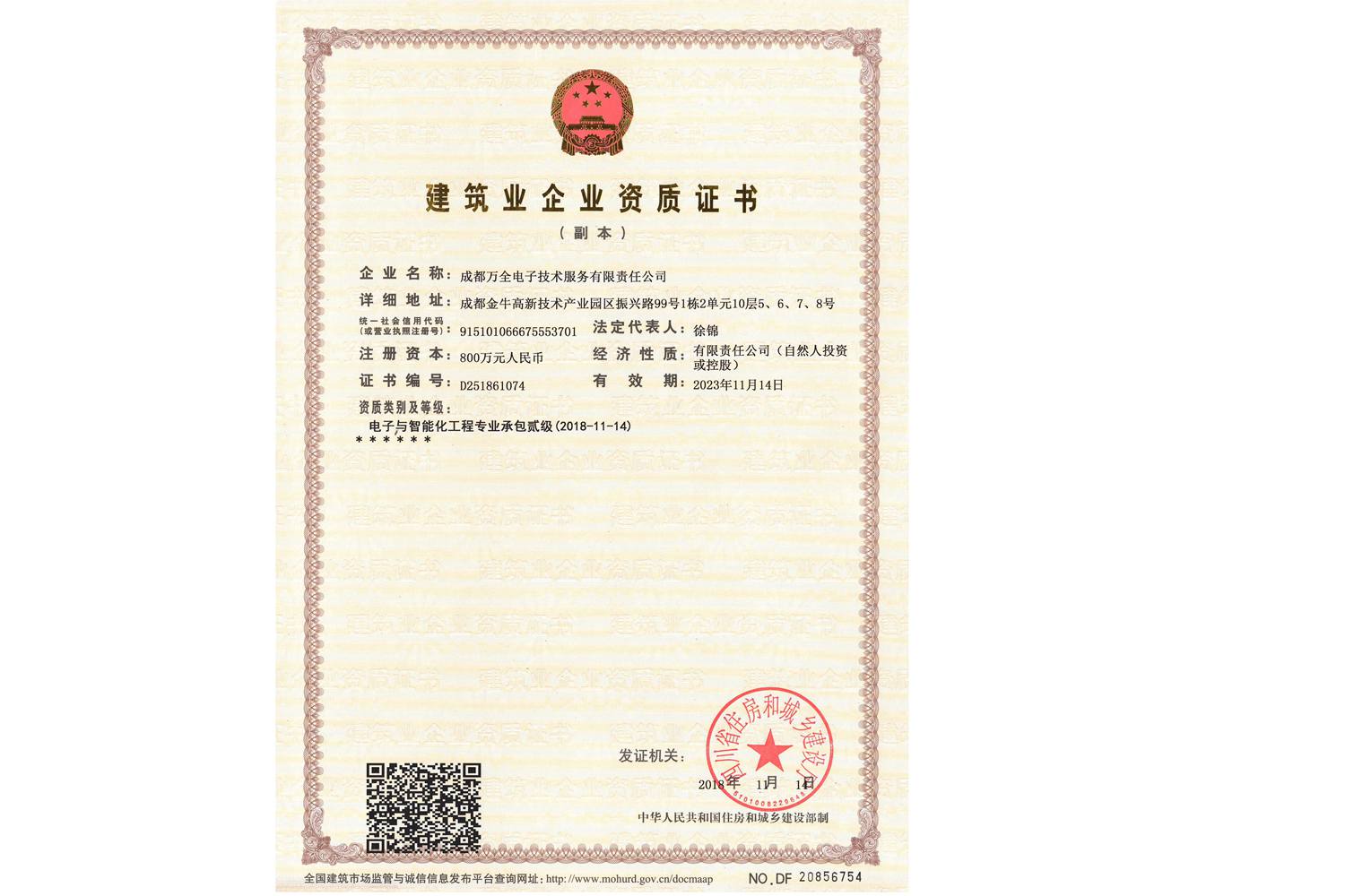 安防工程公司成都萬全電子取得建筑企業資質